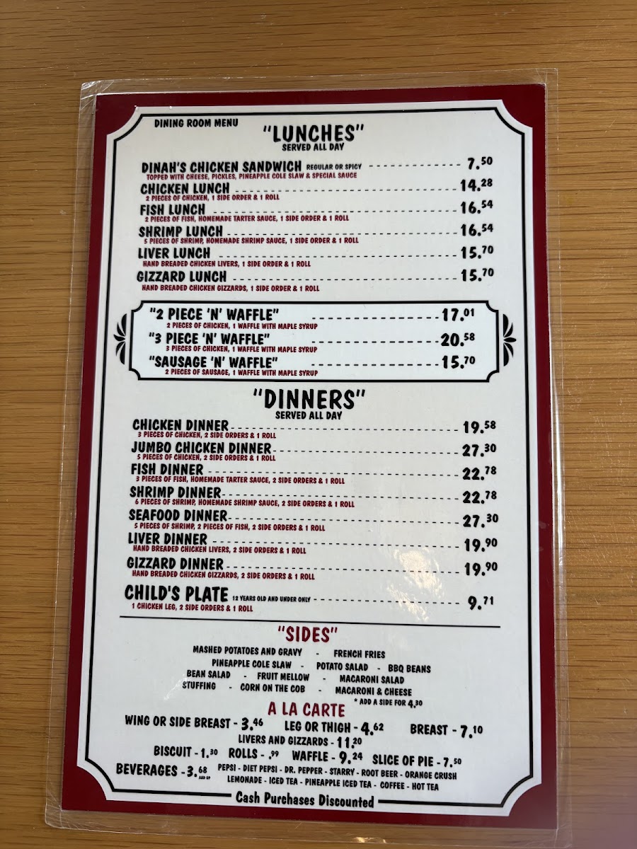 Dinah's Spicy Crispy Chicken Sandwich topped with pineapple coleslaw, pickles, and chipotle sauce. Choice of cheddar or white cheese. Choice of 1 side. With one Large Drink